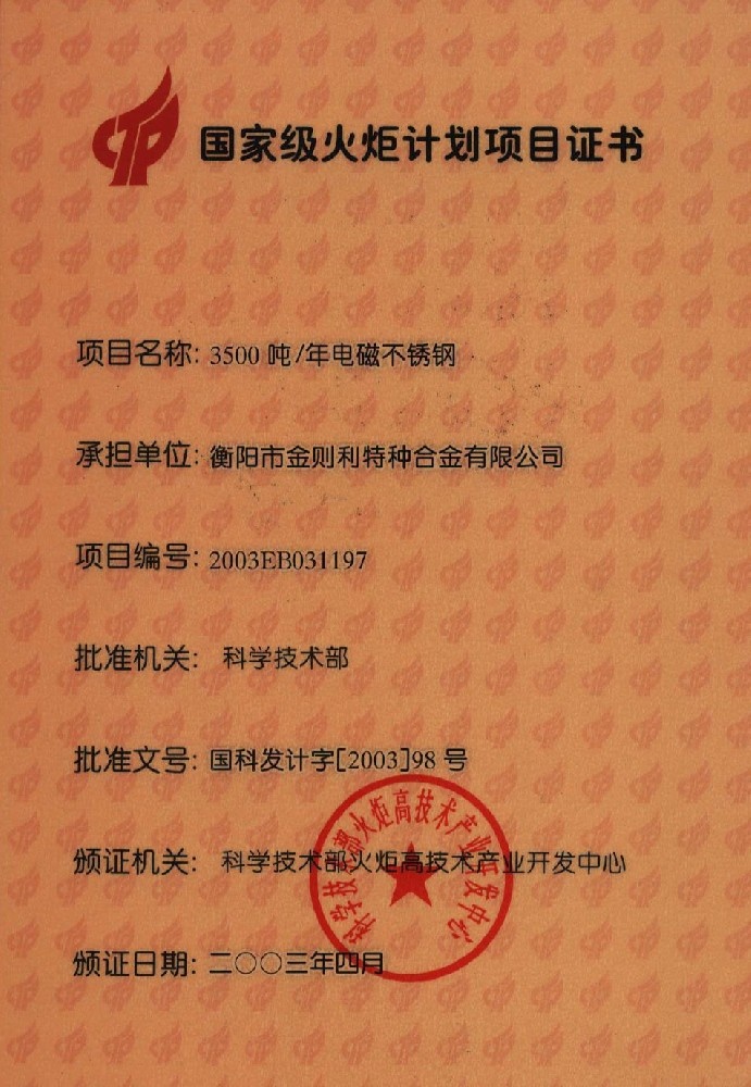 國(guó)家級(jí)火炬計(jì)劃項(xiàng)目證書 |